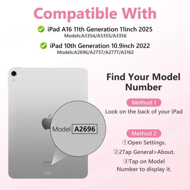 • For iPad 10th Generation Case with Keyboard 10.9 Inch: Precision Compatibility Designed exclusively for iPad 11/10th Generation (2025 models: A3354/A3355/A3356; 2022 models: A2696/A2757/A2777) with 10.9-11 inch displays.Important: Verify your iPads model number (located on the back casing) before purchasethis case/keyboard is not compatible with other iPad versions.