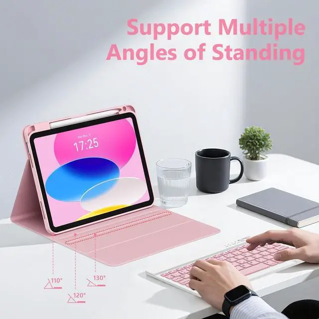 ^^ Marathon Battery: Our for ipad a16 case with keyboard built-in large capacity battery, delivers 200+ hours of working time after just 2-3 hours charging. Adjustable kickstand offers multiple tilt angles for ideal typing or viewing, whether youre working at a desk or lounging on the couch. ^^ This for ipad 10th generation case with keyboard is magnetic and it can be strongly attached to the case or detach completely. When you do not need the keyboard can be stored away, easy to carry it on the go. It is easy, fast and stable to connect via BT, reconnect immediately turning it on. Perfect for typing, editing, or streamingall while maintaining laptop-grade convenience in a featherlight design.