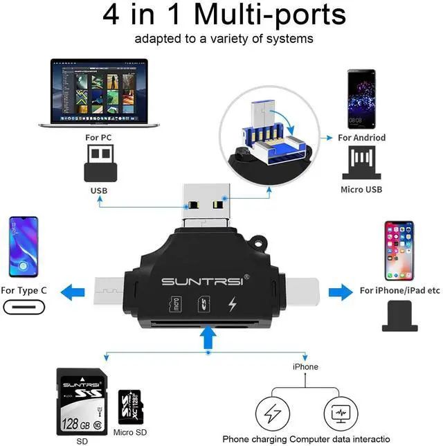 Simultaneous Charging & Card Reading: This 4-in-1 card reader adds a charging port, allowing you to charge your device while reading or transferring files, perfect for outdoor adventures like hiking or camping. No need to worry about running out of battery while transferring files.