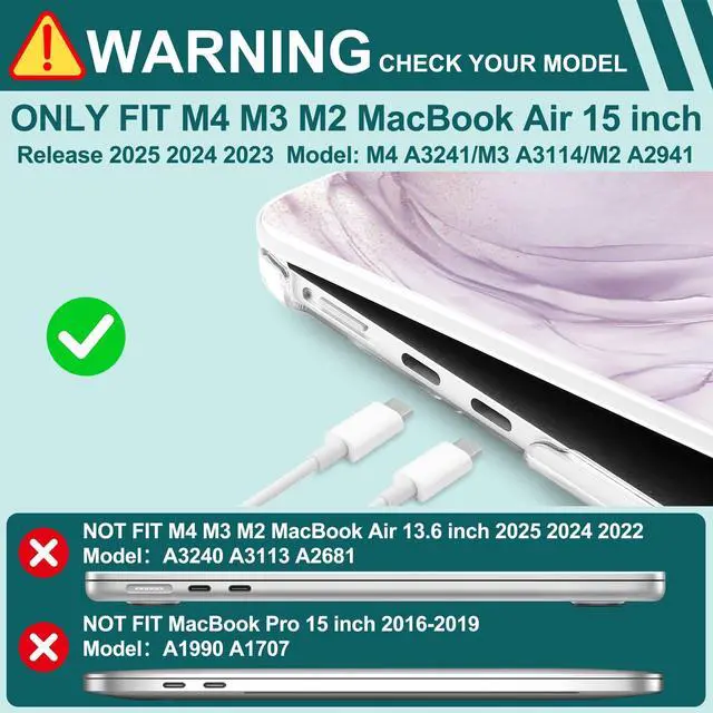Compatible With - Only for M4/M3/M2 MacBook Air 15" 2025 2024 2023 (Only compatible model: A3241/A3114/A2941). Please confirm the model on the bottom of the MacBook before ordering ^^ Durable Material - MacBook Air 15-inch case is made of hard PC material, effective anti-slip/shockproof/anti-scratch etc ^^ Case Design - The case adopts the top and bottom case separation design, easy to install and remove ^^ Case Port Design - Precise cutouts allow full access to all ports, features, buttons, and Touch ID functionality ^^ Package - Included 1 MacBook Air 15 inch Case, 1 Keyboard Cover, 1 Trackpad Protector, 2 OTG Adapter
