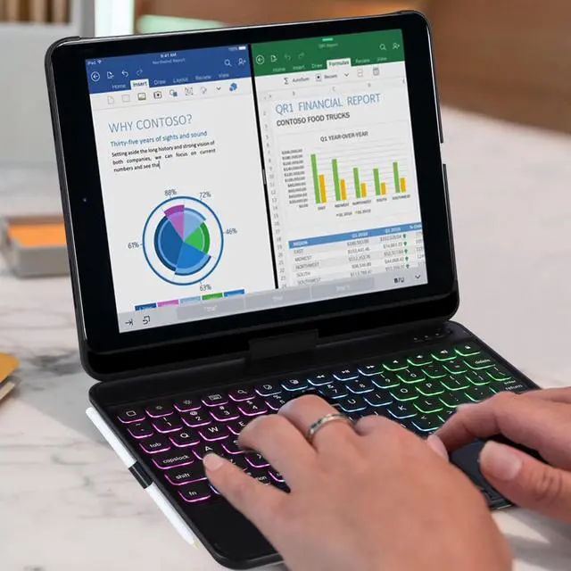 EXPERTLY CRAFTED: the case features a smart 10.9 -inch island keyboard attachment for optimal typing - ideal for taking fast and concise notes on the move. Rotate the screen up to 180 and 360 view angle to effortlessly display your work presentation or watch your favorite show ^^