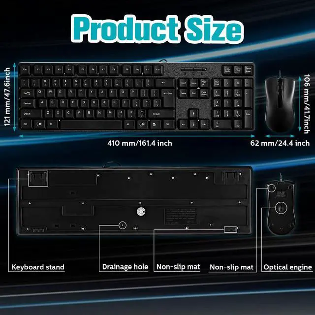 Keyboard: about 16.14 x 4.76 x 0.98 inch/ 410 x 121 x 25 mmMouse: about 4.17 x 2.44 x 1.26 inch/ 106 x 62 x 32 mmPackage includes: 6 x Full size wired keyboard6 x