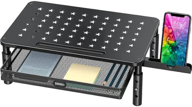 3 Height Adjustable - This ergonomic computer monitor riser with drawer raises your screen at a comfortable eye-level ( 4.13 / 4.92 / 5.71 ). Effectively improve posture to relieve eye-strain, back & neck pain throughout the workdays. ^^ Get Organized with the Metal Drawer&Foldable Phone Holder- Make full use of the space under the stand riser platform to keep your workstation clean and organized. The sliding drawer is perfect for US letter-size paper, and the foldable phone holder on both sides can help you work more efficiently. ^^ Strong& Stable -Holding up to 44 lbs, this adjustable monitor riser is made of super durable steel for heavy monitors.