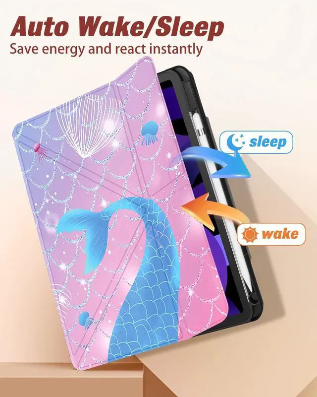 ^^ This for ipad air case 11 inch/for ipad air 5 case/for ipad air M3 2025 & M2 2024 11 inch case with pencil holder on the inside, and magnetic pen slot also retained on the back. So you can place and remove your pencil easily. It can prevent you from losing or breaking your apple pencil while walking or outdoors. ^^ Built-in magnetic strip, this for ipad pro 11 inch case 2024 with the smart function of auto sleep and auto wake, no wasting the power energy and extend standby time. ^^ This for ipad air case with cute cool pattern, making it look more stylish.