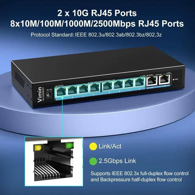 2.5G /10G 8+2 Port Aggregation - 82.5G & Dual 10G Base-T ports deliver ultra-fast 10/100/1000/2500Mbps auto-negotiation, perfect for bandwidth-intensive NAS/PC connections with future-proof 10G Ethernet scalability. ^^ Wire-Speed 10G Network Switch - Non-blocking 80Gbps switching capacity ensures zero packet loss for 4K streaming/gaming, supporting full IEEE 802.3 bz 2.5G /5G standards and backward compatibility with CAT5e/CAT6 cables. ^^ Flow Control - Dual-mode IEEE 802.3 x (full-duplex) & Backpressure (half-duplex) technology prevents data overflow, maintaining stable 10GBase-T connections for IP cameras/SMB servers. ^^ Plug & Play Network Switch - Auto-MDI/MDIX with dynamic LED indicators enables instant deployment - simply connect CAT6A cables for instant 10Gbps uplink without complex configurations.