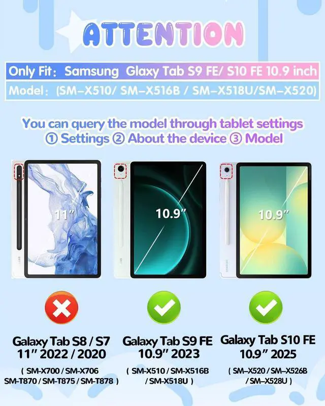 Compatibility: The cute case is ONLY compatible with Galaxy Tab S10 FE / S9 FE 10.9 Inch ^^