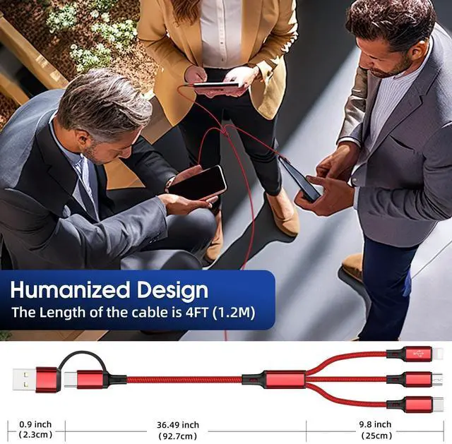 ^^ Convenient and PortableIdeal length 4Ft/ 1.2M is optimal to use in home, office, car, traveling & more. Nylon braided 6-in-1 Charger Cable is very easy to fold and place in your handbag, laptop bag, pocket etc. The multi connectors allow you to enjoy videos, games, chat. Charging multi device at the same time, without the clutter of multiple cables. ^^ What You Can GetWith this purchase, you'll receive 3X4FT universal phone charging cables(Black/Red/Silver), providing you with a reliable charging solution for all your devices.