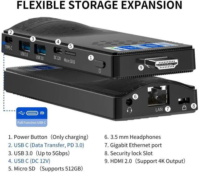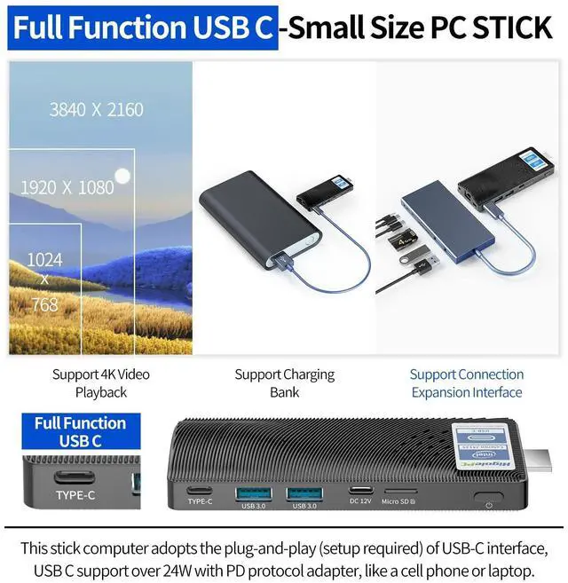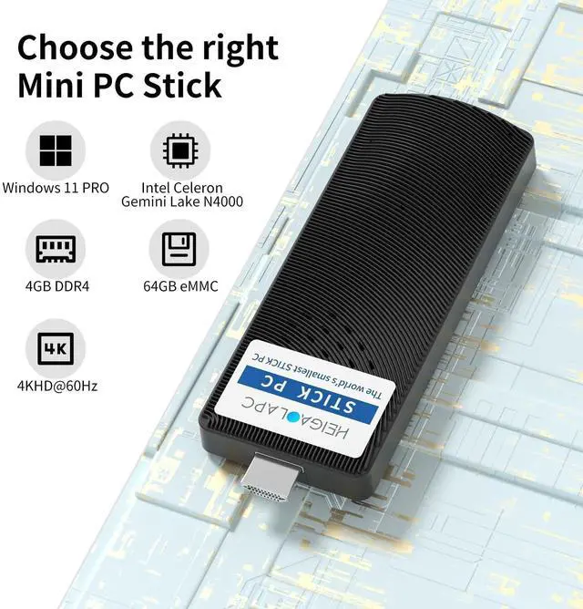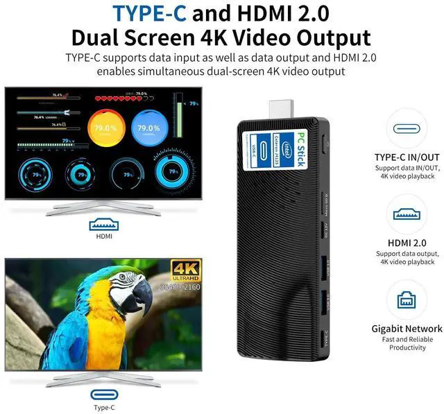 Support Linux and Win11HEIGAOLAPC mini pc stick equipped with Celeron N4000 ( 1.1GH z) processor, support Win 11 Pro OS, support Linux, Ubuntu as well. This portable and powerful pc computer is a great helper for your business, office, entertainment use, classrooms, conference rooms, industrial IOT applications, home and more. ^^ USB-C and Multiple Interfaces HEIGAOLAPC small pc equipped with 1x USB-CBroader compatibility, 2 x USB 3.0 ports, TF Card reader, 1x HDMI 2.0 ports, 1x Gigabit LAN Port, 1x 3.5 mm Audio jack, You can connect with multiple devices like projector, NAS, monitor, keyboard mouse, etc.