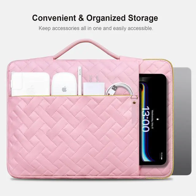Accessory Storage Capabilities: Impressive storage system with easily organized front zippered pockets, this laptop case is large enough to hold all of your laptop accessories in one place. Such as cables, charger, power adapter, mouse, keyboard, Airpods. Each pocket is strategically placed to maximize space and accessibility without compromising on the laptop bag's sleek and portable form.