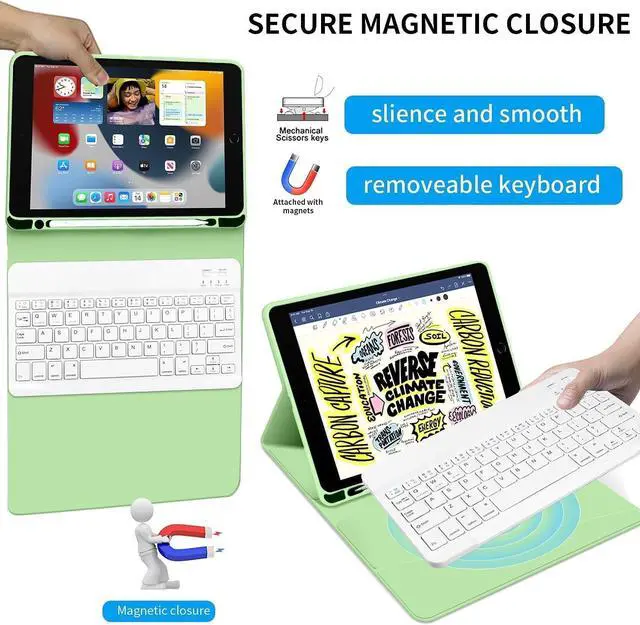 • Slim Wireless Bluetooth KeyboardThe slim (6.2mm) removable keyboard is attached to this iPad 6th generation case with keyboard magnetically (supporting Windows, IOS & Android System), let your iPad instantly become a portable laptop, perfect for working, typing, editing or watching videos, greatly improved your iPad productivity.