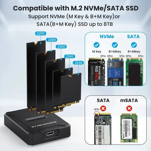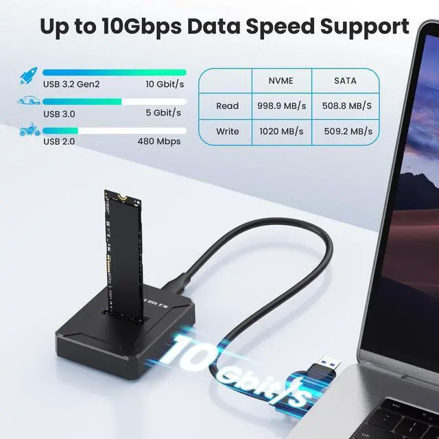 SATA SSD Support: M. 2 to USB adapter support both SATA (NGFF) and NVMe (PCIe) M. 2 SSDs in various sizes 2230/2242/2260/2280/22110, supports most common formats like M. 2 NVMe/PCIe M key and B&M key SSDs, as well as M. 2 SATA/NGFF B&M key SSDs but NOT M. 2 SATA AHCI B Key SSDs ^^ Ultra-Fast Transfer Speeds up to 10Gbps: SSD docking station delivers exceptional transfer speeds. Experience up to 10Gbps with M. 2 NVMe drives and 6Gbps with M. 2 SATA/NGFF drives via USB 3.2 Gen 2 cable. This M. 2 reader solution is good for rapid data transfer and backups, transferring an HD movie in just 2-5 seconds ^^ Design for Easy Insertion and