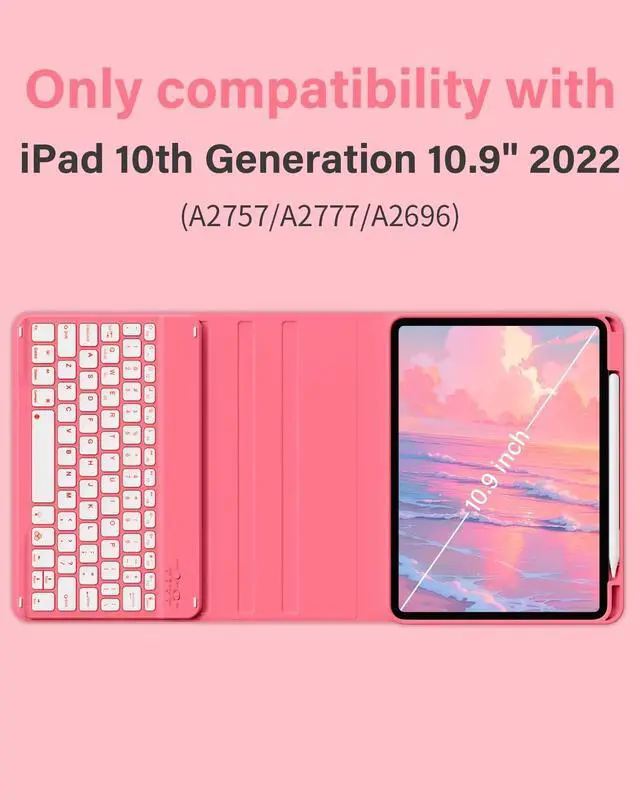 Generation 2022 10.9 inchModel: A2696/A2757/A2777). It is Not compatible with any other devices. Please check back bottom of your iPad to find the model number. ^^ Adjustable 7 Colors & 3 Modes Backlit KeyboardThis iPad keyboard case is designed with 7 different colors and 3 adjustable modes, allowing you to adjust the applicable color to illuminate the keyboard even in dim light for easy typing, you can choose your favorite color and mode, easy to switch to make it more convenient for you to use and bring you a different visual enjoyment. ^^ Multiple Viewing and Pencil Holder Keyboard Case 10.9" -the keyboard is magnetically attached and very versatile and the thoughtful design easily adjusts to whatever comfortable angle suits you best. That makes the IPad work like a laptop, so it's perfect for working, typing and editing or watching videos. It has a pen slot inside to prevent the apple pencil from being lost, grab your Apple Pencil, Pencil Cap and Adapter effortlessly whenever you want, easily to carry your with your device. ^^ Magnetic Detachable Keyboard & Long Life Battery The magnetic for iPad keyboard and case are separated, magnetically attached, the keyboard can be removed from the case.