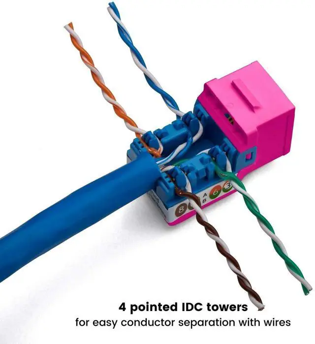 SUPERIOR PERFORMANCE. Component level rated. Suitable for 10 Gigabit (10/100/1000/10000 Mb/s) up to 328 feet. Compatible with 23 to 24 AWG solid copper conductors. Supports PoE/PoE+/PoE++ (IEEE 802.3 af/at/bt) 4PPoE up to 100W. Press-Fit Technology makes our product more reliable and increases transmission performance. Tested up to 500 MHz. ^^ DURABLE. 90-degree design with IDC retaining cap. Tough ABS plastic construction. Highly visible colors printed on the side for easy T568A or T568B wiring. Corrosion-resistant nickel and tin-coated phosphor bronze termination prongs and gold plated RJ45 contacts. ^^ VERSATILE.