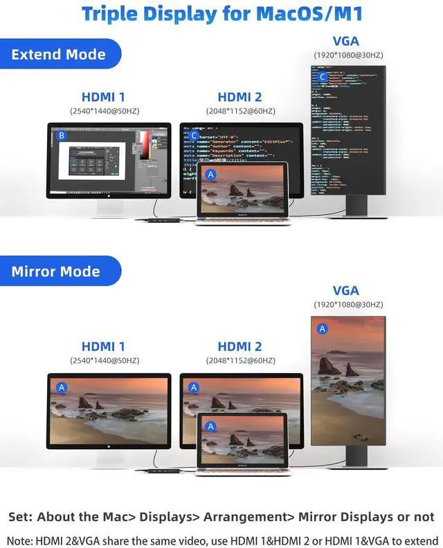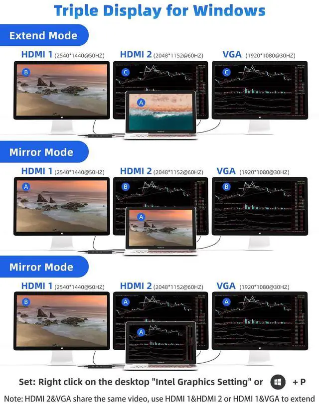 Note: HDMI 2 and VGA share the same video, please use HDMI 1 and HDMI 2 or HDMI 1 and VGA to extend 2 monitors. ^^ 12-IN-1 USB 3.0 &
