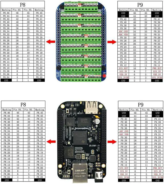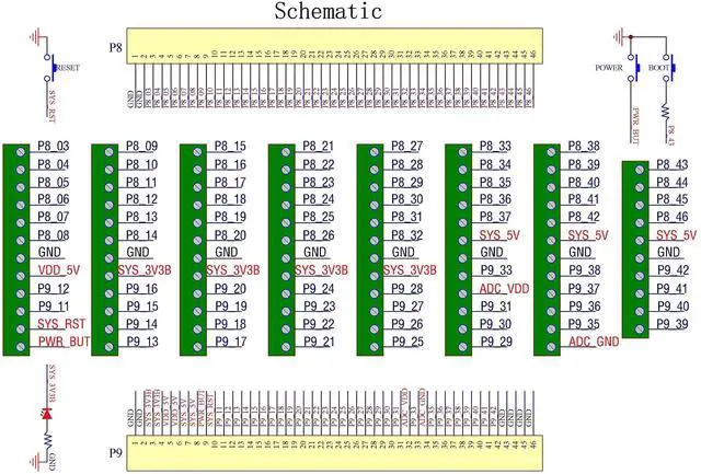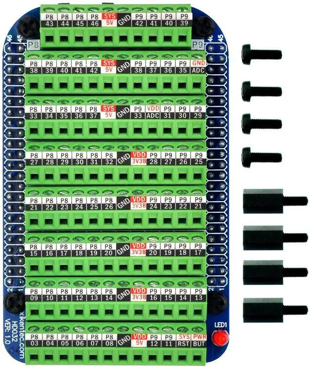 Terminal Block Breakout Module - for BeagleBone, BeagleBone Black, BeagleBone AI, BeagleBone Black Wireless, BeagleBone Green, BeagleBone Green Wireless or SanCloud BeagleBone Enhanced. ^^ Terminal block pitch 3.5 mm/ 0.138", wire size range 26AWG to 16AWG, strip length 5mm, screw M2 steel, pin header and cage copper. ^^ With power on LED indicating, with Power, Reset and Boot buttons on the side. ^^ The item has been soldered and assembled.