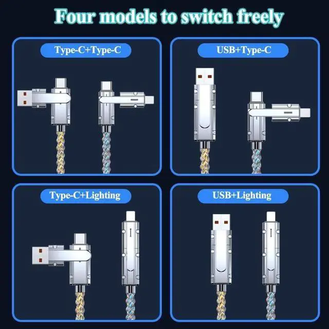 ^^ Enhanced Durability 4 in 1 light up charging cable adopts aluminum alloy shell micro-arc oxidation process. And the cable is braided with strong fiber and provide fast charging and safety to users. All multiple led charging cable has been passed 60000+ times bending tests in factory. ^^ Widely CompatibleRGB Colorful Gradual Multi Led charging cable works with Most Type-C/USB A/Lighting devices. Lighting Compatible with Phone 17/16/15/14 Pro Max, Type-C Compatible with Samsung Galaxy S24/S23/S22/S10+/S10S9/S9+/S8/S7, Huawei, HTC, SONY, OnePlus, Moto and so on. ^^ What you will receiveYou will receive 1x 66W 4 in 1 RGB Flowing LED fast charging cable and excellent customer service, if you have any qustions about our light up charging cable, feel free to contact us, we will give you satisfactory solution within 12 hours.