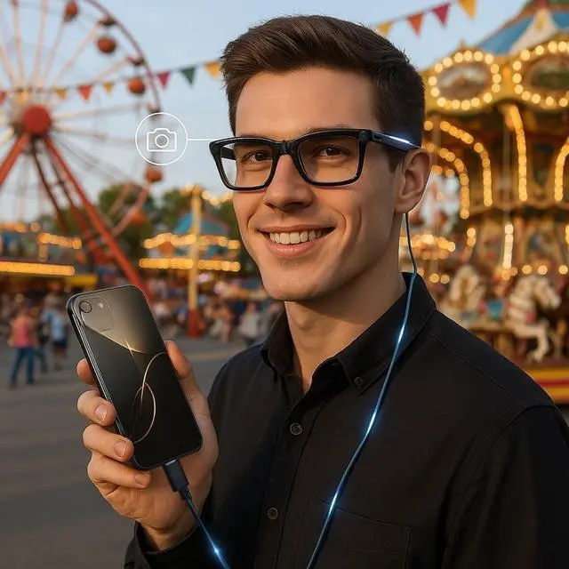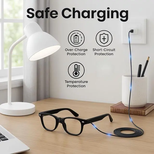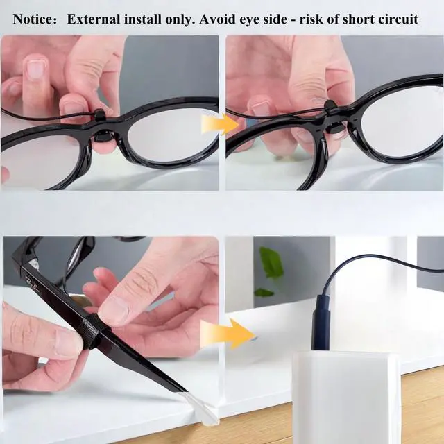 Notes: 1. Use the included charger for optimal charging performance. 2. Make sure the U-shaped Pogo pin connector is attached to the outside of the glasses frame. Connecting it to the inside may prevent proper charging and trigger an error mode, causing the white LED to flash. When white LED flash, Follow your Ray-Ban smart glasses' official instructions to clear the error and return the device to normal operation. 3. If using another power source, such as a third-party charger or phone, first attach the U-shaped connector to the glasses, then connectthe USB-C port to the power source. Otherwise, charging may not work properly. What If the White Light Is Flashing? This indicates a connection error, usually caused by inserting the charging cable the wrong way. Please follow the steps below to reset the glasses: 1. Disconnect the charging cable if it was connected from the wrong (inner) side. 2. Press and hold the photo button located on the right temple of the glasses. 3. While holding the photo button, toggle the power button on the left temple: Switch it from ON to OFF, Wait for 3 seconds, Then switch it from OFF back to ON. 4. Release the photo button only after the power is switched back ON. 5. After the reset, reconnect the charging cable correctly from the outside of the glasses to resume normal charging.