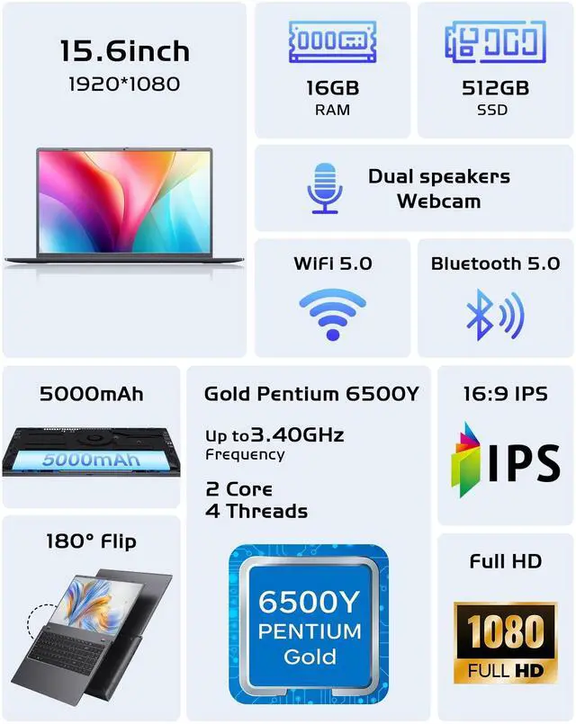 Engineered for Professional Efficiency Tackle your workday with confidence powered by the Pentium Gold 6500Y processor (Up to 3.4GH z). This efficient dual-core CPU is designed to handle the demands of a busy professional, making this pc laptop a true work laptop that ensures smooth performance as you seamlessly switch between spreadsheets, presentations, and video conferences without frustrating slowdowns. ^^ Instant Performance with Generous Storage Boost your productivity with substantial laptop 16gb ram that effortlessly handles multiple business applications simultaneously. Paired with a speedy 512GB SSD, you'll enjoy instant boot-ups, quick file access, and ample storage for all your work essentials - the perfect combination for any business laptop or student laptop who values efficiency and performance.