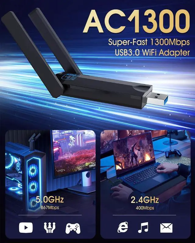 1300Mbps High-Speed WiFi Upgrade - Turn Non-WiFi PCs Wireless The Nilone USB 3.0 WiFi Adapter upgrades your WiFi-less PC/laptop to 802.11 ac standarddelivering up to 1300Mbps total speed (3x faster than built-in wireless adapters! ). Enjoy long-range, lag-free, and seamless wireless connectivity for all your needsno more struggling with wired constraints or slow built-in WiFi. ^^ Dual-Band 5GHz & 2.4GH z - No Buffering, No Interruptions Switch freely between 5GHz (up to 867Mbps) and 2.4GH z (up to 400Mbps) bands: 5GHz is perfect for 4K streaming, online gaming, and large file transfers (ultra-low latency for smooth gameplay), while 2.4GH z offers wider coverage for everyday web surfing. Say goodbye to buffering, lag, and dropped connectionsenjoy a frustration-free wireless experience. ^^ Dual 5dBi High-Gain Antennas + USB 3.0 Two 5dBi high-gain antennas significantly boost signal reception and transmissionstrengthen WiFi coverage, penetrate walls, and maintain stability even in large homes or offices. Equipped with Super-Speed USB 3.0 (10x faster than USB 2.0 ), it ensures lightning-fast data transfer without bottlenecks, keeping your connection smooth and responsive. ^^ Wide Compatibility + Plug-and-Play Ease Works seamlessly with Windows 11/10/ 8.1 /8/7/XP, Mac OS 10.9 - 10.15, and Linux. Plug-and-play for Windows 10/11no drivers needed (just plug in and connect! ). For other systems (Windows 8.1 /8/7/XP/Vista, Mac OS, Linux Kernel 2.6. 24- 4.7 ), setup