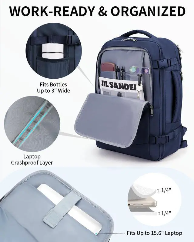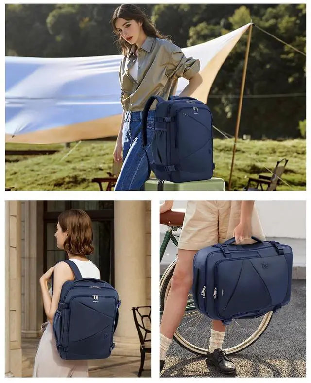 ^^ 3 Ways to Carry, Effortless Packing! The main compartment of this suitcase backpack opens a full 180 degrees, making packing and unpacking a breeze. The zipper features two sliders for easy access from either side. With padded top and side handles for comfortable carrying and a trolley sleeve on the back to attach it to your luggage, its perfect for travel or commuting. ^^ Relieve Pressure, Travel BetterThis commuter backpack features adjustable, breathable padded shoulder straps and an ergonomic back pad for ultimate comfort on the go. The padded straps evenly distribute weight to reduce strain on your shoulders, making it perfect for long commutes or trips. Plus, this carryon backpack made from at least 50% recycled materials, with fabric and lining crafted from 34 recycled PET plastic bottles. Travel sustainably and comfortably!
