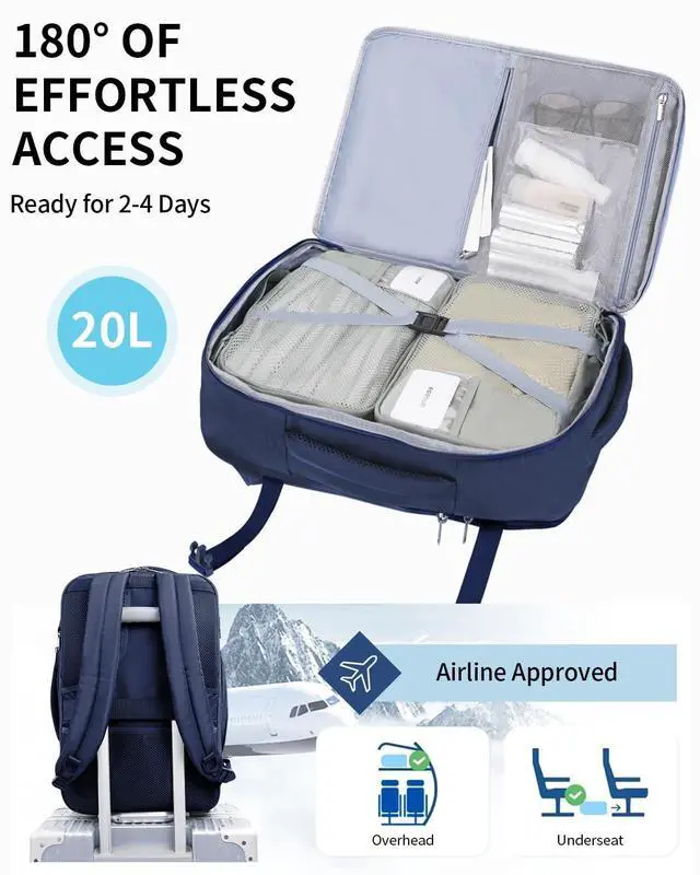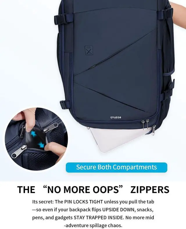 AVOIDING BAGGAGE CHARGES ON FLIGHT: ECOHUB Airplane travel backpack have the perfectly sized to avoid baggage fees. The underseat carry on bag measures 17x11x 5.5 inch and has a capacity of 20L, with a weight of 2.25 lb. Suitable for all major airlines like spirit, frontier, easyjet. ^^ No Accidental OpeningBuilt for security and convenience. It features two auto-lock sliders on the main and laptop compartments to prevent accidental openings. An anti-theft pocket on the back keeps your valuables safe, while a side pocket allows for quick access to your passportperfect for travel. Plus, the water-resistant fabric ensures your essentials stay dry in light rain. Enjoy peace of mind with this anti-theft backpack! ^^ Work-Ready, Stay OrganizedFeatures a 17 laptop compartment that fits thick laptops up to 15.6" and slim ones up to 17". As a multi-pocket backpack, it includes 12 pockets to keep everything organized. Despite its expandable design, theres a pocket for water bottles up to 3" wide and a USB slot for convenient chargingmaking it work-ready! Additionally, a large wet pocket keeps your items dry, and reinforced stitching ensures this backpack is built to last.