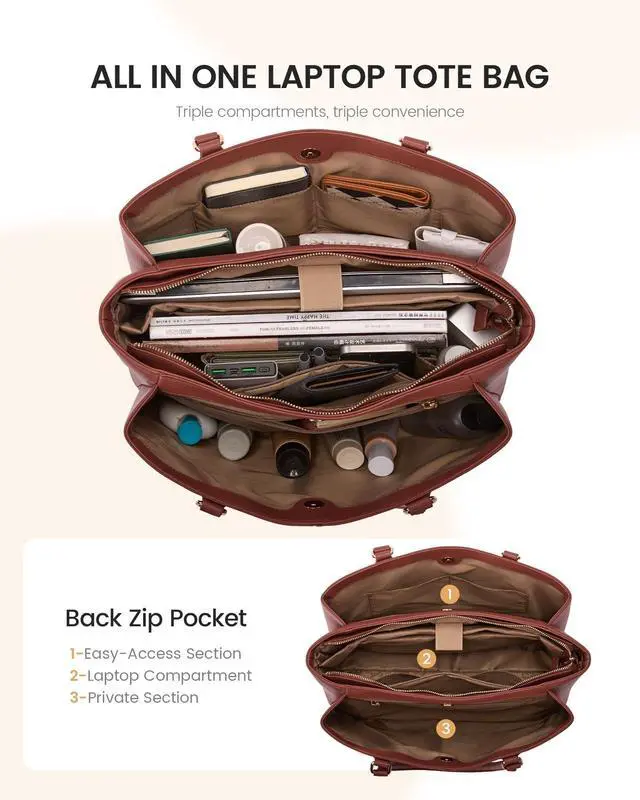 3-Zone Organized & Quick Access SystemThis LOVEVOOK tote features a smart 3-compartment layout. The central zipper secures laptops up to 17.3 inches, while two magnetic-flap sections offer instant access to essentials. This design ensures superior organization, making it the ultimate work tote bag for women ^^ All-Weather Protection & Built to LastCrafted from premium water-resistant PU leather with reinforced stitching, this chic and durable tote features a padded laptop compartment and protective metal feet to prevent scratches and moisture, while its 17.5" L 6.5" W 12.5" H size keeps your belongings safe, organized, and stylish for work or travel ^^ Multiple Pockets for Neat StorageThis organized tote bag includes multiple inner pockets to securely hold smaller items like your phone, charger, pens, and cosmetics.