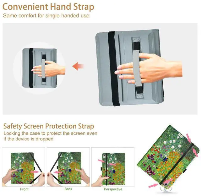 Screen Protection Band: Tie and lock the iPad Case with the Screen Protection Band when not using the iPad. To keep the case closed if the device falls, and gives much better protection to the screen. Add an extra lock to your device and privacy when you're not using; The Convenient Hand Strap beside the stripes enables you to hold it more stable when stays upright. Same comfort for single-handed use.