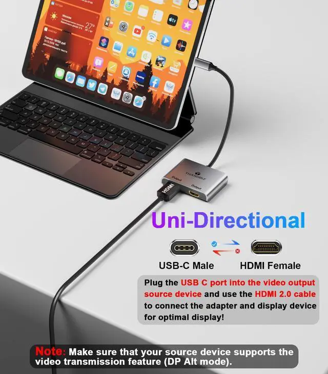 Material Structure Design: the product cable adopts multi-layer signal shielding structure, effectively shielding electromagnetic interference, transmission is smoother, integrated aluminium alloy shell can give full play to the advantages of heat dissipation, so that you no longer worry about the problems brought about by heat, gold-plated ports to reduce the loss of signal transmission, the transmission of more stable signals, and achieve lossless transmission. ^^ ImportantPlease note whether your USB C source device port supports video transmission or DP Alt mode (you can usually see the DP logo next to the port) It is not bi-directional, and only supports uni-directional USB C source signals to HDMI displays Make sure that your output device and display device support 4K resolution and connect the adapter with an HDMI 2.0 cable, otherwise it will affect the display effect. (If you are not sure, please contact us, we are happy to help you! ) ^^