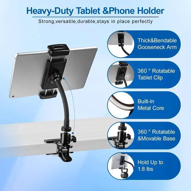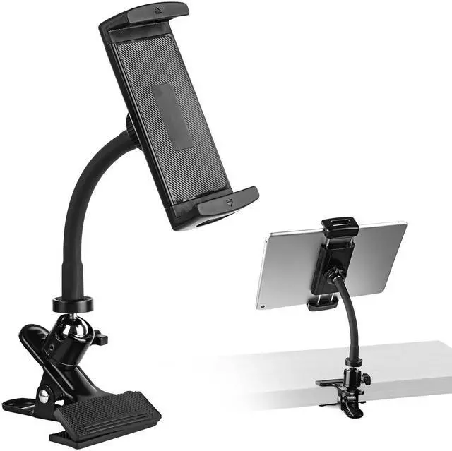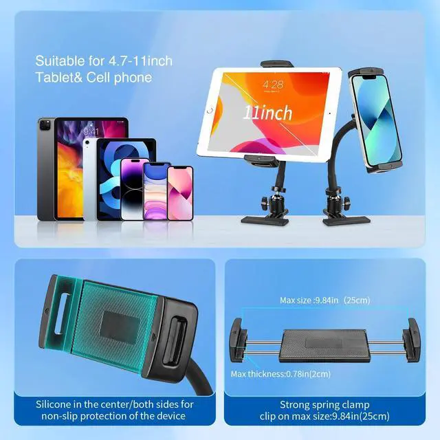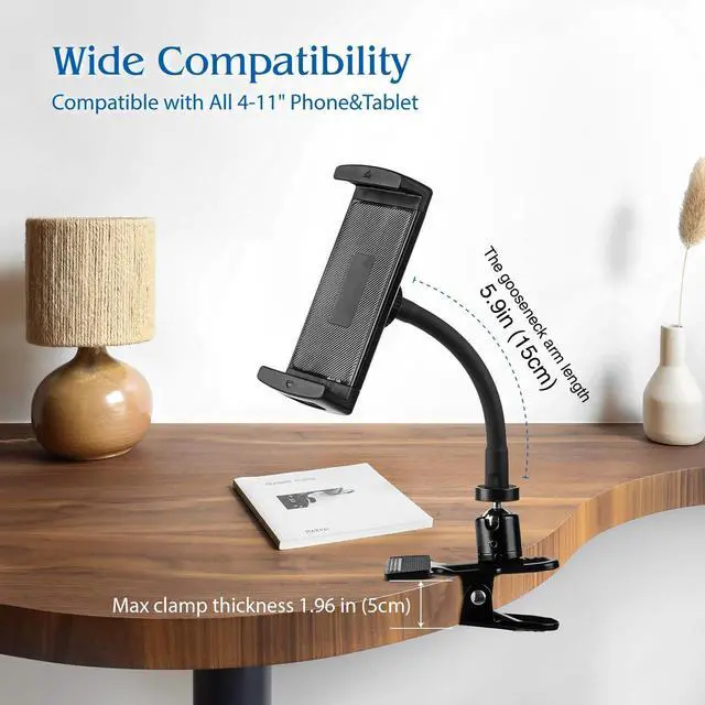 Wide Compatibility (411") This clamp on tablet holder fits devices from 4 to 11 inches, including iPad Pro 11", iPad Air, iPad Mini, Kindle, iPhone, Samsung Galaxy & moreeven with protective cases. A true iPad clamp mount for both large tablets and small phones. ^^ Reinforced Metal Gooseneck, No DroopingOur gooseneck tablet holder is built with a 5.91 inch metal core for unmatched stability, yet flexible enough to bend to the perfect viewing height. ^^ Heavy-Duty Clip for Desk & More Designed as a strong iPad holder for desk, tables, cabinets, kitchen counters, and even thick round poles.