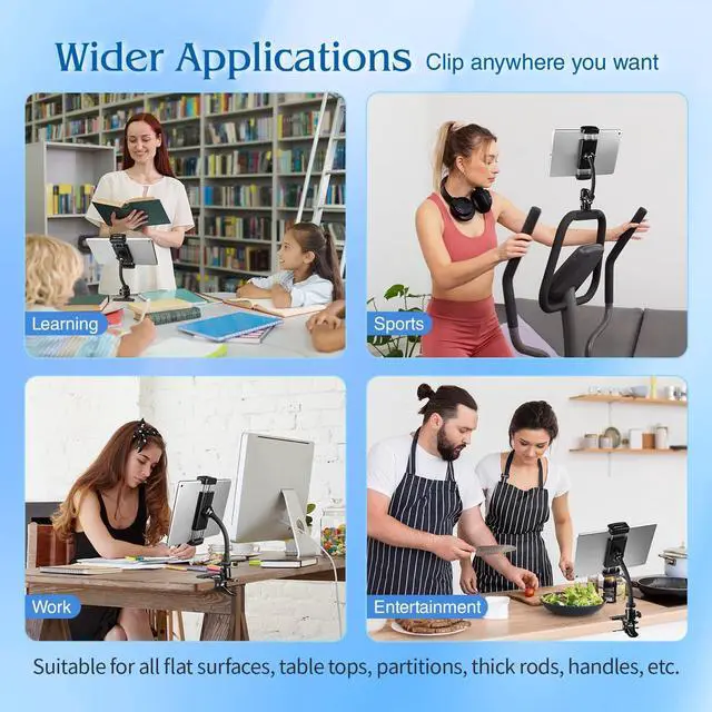 The secure tablet clamp base opens up to 2 inches (5 cm), holding firmly on surfaces for work, study, fitness, or cooking. ^^ 360 Swivel Base + Flexible AnglesUnlike fixed stands, our gooseneck iPad holder features a fully strong and rotatable ball joint plus a bendable armgiving you the freedom to adjust in portrait or landscape for video calls, recipes, or workouts. ^^ Hands-Free Comfort AnywhereFree your hands and reduce neck strain with this versatile clip on tablet holder. Perfect for desk setup, bed entertainment, kitchen cooking, or as an exercise bike tablet mountone stand fits every scenario.