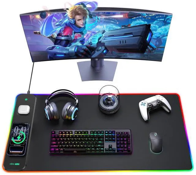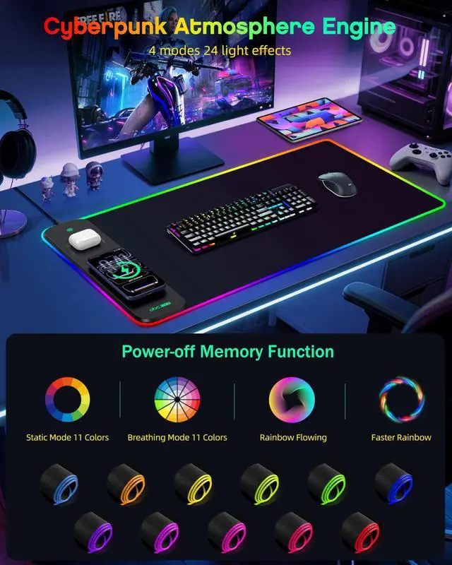 Charge Phone & Earbuds Simultaneously 7.5W magnetic charge for iPhone 16/15/14/13/12/11/XR/XS/8 Series careless or with magnetic case, Max 15W for Galaxy/Pixel/LG, 5W for Airpods 2/3/4 (with ANC) and AirPods Pro 1/2, charge effortlessly while gaming! ^^ 24 RGB Light Spectacle & Memory Function Choose from 11 static colors, 11 breathing effects, rainbow waves, or fast rainbow mode; Power-off memory saves your favorite lightingno need to reset every time! ^^ Smart Safety & Anti-Slip Design Built-in Smarship tech prevents overcharging, overheating, and short circuits; Natural rubber base with textured grip keeps the mat firmly in place during intense gameplay ^^ XXL Premium Surface & Ergonomic Comfort Massive 800x400mm space fits keyboards, tablets, and gear; 0.13" thickness cushions wrists, while the ultra-smooth surface ensures pixel-perfect mouse tracking ^^