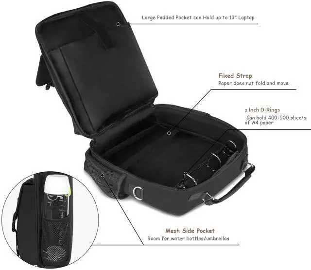 ^^ Expansive Capacity: 13.5" x 13.5" x 3". This Binder Bag boasting a massive 2-inch D-ring binder that reliably holds over 500 sheets of A4 paper. The dedicated front compartment securely fits laptops and tablets up to 14 inches. Inside, multiple pockets can help you organize pens, cards, and loose documents neatly.