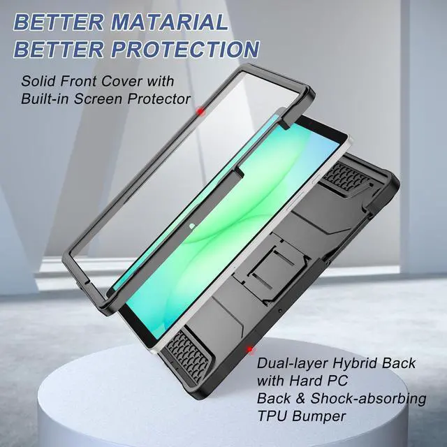 CompatibilityExclusively designed for Newest Samsung Galaxy Tab A11+ 2025/A9 Plus 11 Inch(SM-X210/X216/X218, 2023 Released)ONLY. Please kindly check the model number SM-X*** at the Setting of the tablet before purchase ^^ Rugged Armor Full Protection Multi-layered hard PC back and flexible TPU bumper provide full protection against drops, bumps, and impacts, also easy to install ^^ Built-in Screen ProtectorPrevents your New Galaxy Tab A11+/A9+ 11 Inch screen from scratches without compromising sensitivity and provides full protection ^^ Built-in KickStand Functional pop-out kickstand with dual stand angles for easily enjoying movies and better working. FREE YOUR HANDS ^^ Precise Cutouts Precise cutouts and design allow easy access to all ports, sensors, speakers, cameras without removing the case