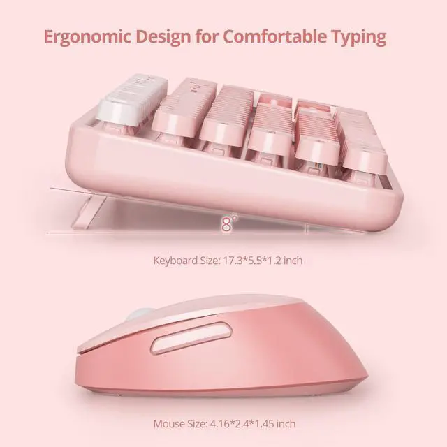 ^^ Ergonomic Design: Designed for comfort, this pink keyboard and mouse wireless combo includes a folding holder and anti-slide pads to maintain an optimal slope. This ergonomic design prevents wrist strain, ensuring you can type comfortably for extended periods.