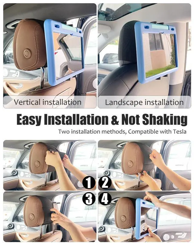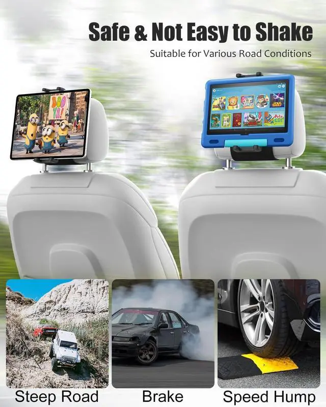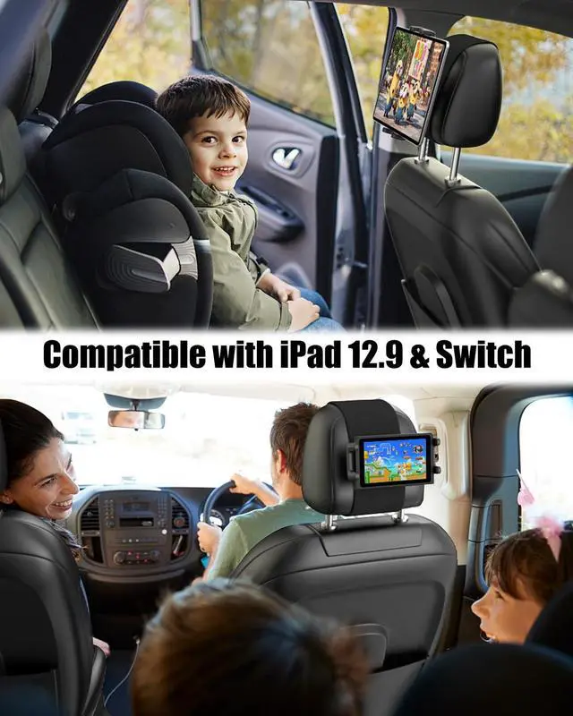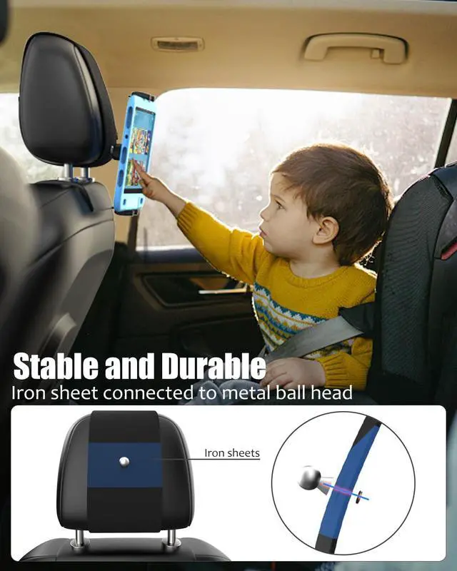 Easy to InstallHeadrest tablet holder for kids is designed with elastic band and velcro, made of durable and safe material, the adjustable headrest strap supports horizontal or vertical installation of different sizes of car rear seat headrests, suitable for different sizes of headrests. ^^ Anti-Drop DesignThis upgraded version of the car back seat tablet holder is fixed with a metal ball head connecting the iron piece, and there is an iron piece in the bracket to bear the weight, So you dont have to worry about your tablet falling or being unable to stabilize your device.