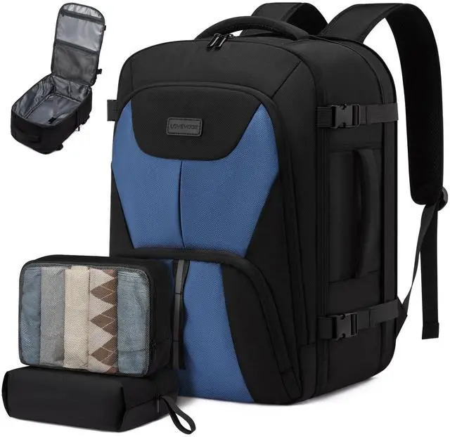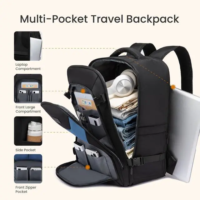 40L Expandable Large CapacityTravel backpack for men women with expandable design, backpack for travel giving you flexible large capacity from 30L to 40L. Carry on backpack has 3 large compartment for your ipad, laptop, clothes and travel essentials. ^^ 2 Packing Cubes for Daily EssentialsTravel backpack with 2 cubes for organized storage of sweaters, jackets, pants, shirts, shoes and toiletries. Crafted from water-resistant polyester, it protects your belongings in various weather conditions. ^^ 12-Pockets Smart Orgnaztion & 180 OpeningThis carry on backpack for men has 12 pockets for iphone, ipad, power bank, laptop, clothes, shoes, sweaters daily and travel essentials.