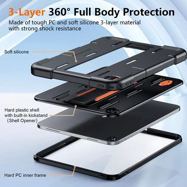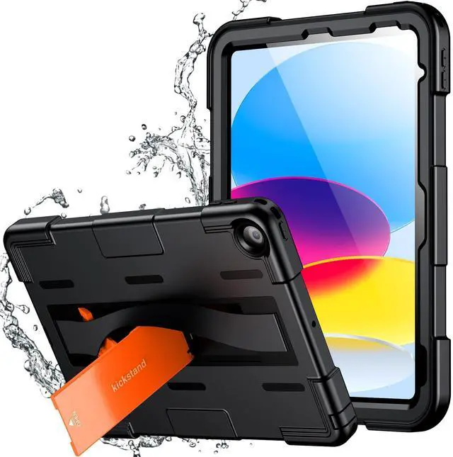 (Note: Please check all of the plugs are sealed before using underwater) ^^ Invisible Kickstand & Elastic Hand Strap & Portable Shoulder StrapSturdy built-in kickstand easy to push out and back in, provides multi-angle viewing, offering a pretty convenient use experience for film watching, working, typing and Studying. The Elastic Hand Strap helps you hold your iPad 10th gen easily, with portable shoulder strap allows you to carry your iPad conveniently, You can even hang it behind the headrest of your car seat or anywhere you want ^^ Full Body 3-Layer ProtectionFlexible outer silicone with hard PC inner shell and top PC frame providing full body protection for your iPad, prevent from drops, shocks, bumps, scratches and dirt. No worry your iPad would slip out of your kids' hands and break. Full access to all ports, buttons and cameras without removing the case ^^ Customer Service Product may be occasionally damaged during transportation, please feel free to us if you receive defective items or have any issues, we will reply to you within 24 hours