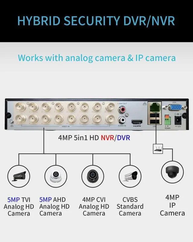 Dual-stream: network video and local recording. CMS and web-based remote monitoring software on PC. Up to 1080P HDMI and VGA Video Output Resolution. USB Backup and USB Mouse. ^^ Multiple video formats input including Full HD/TVI/CVI/AHD, SD/960H/composite video, and IP/network to work with various existing and new HD surveillance system. Full HD picture quality for solid day & night surveillance applications. TVI & AHD up to 5MP, CVI up to 1080P, and IP camera up to 8MP resolution. Multiple Video Out connectors for extra viewing needs including: HDMI/VGA/IP network video monitoring. DVR is compatible with all ONVIF compliant IP cameras. ^^ User friendly setup instructions including QIG (Quick Installation Guide) for PC based VMS/CMS integration. Cloud based cell phone APPs for both Android and iPhone without confusing port forwarding, and real time Snapshot alarm notification. There are options to show 1, 4, 8, and 16 cameras simultaneously on both the mobile APP on cell phone and also the Central Monitoring Software (CMS) on PC. ^^ e.