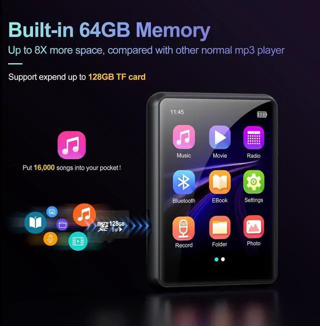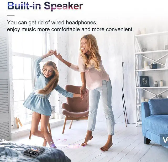 Note: The Bluetooth function only connect Bluetooth headsets and Bluetooth speakers. ^^ 64GB Large StorageThe MP3 player is equipped with 64GB of large storage, which can easily hold thousands of music, put all your favorite songs in. Fill a small player with your favorite music, let you become a mobile music library, enjoy the music feast anytime, anywhere. ^^ Hifi Lossless Sound Built-in powerful audio decoder chip, which can better convert the source code into the most original sound, providing HIFI class sound that is close to the original. Give you better music enjoyment. ^^ Built-in HD Speaker The MP3 player has built-in HD speakers, which can play music without earphones, and no longer need to feel the pain of wearing earphones. When you want to listen to music quietly by yourself, you can also plug in the headphone cable and enjoy your own good time. ^^ Multifunctional Multiple functions in one, music play, FM radio (need to insert a wired headphones), voice recorder, e-book, picture, video, alarm clock. If you have any question, please feel free to contact us, we promise to give you a satisfactory solution.