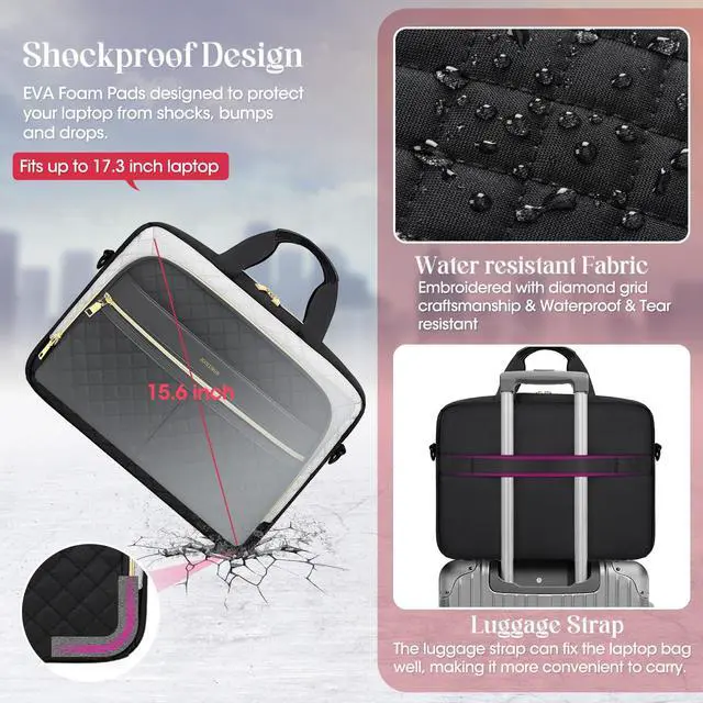 -COMFORTABLE CARRYING: This laptop bag with adjustable padded shoulder strap that can adjust the length to fit different heights and reduce shoulder pressure. Sturdy PU handles ensure comfortable carrying for extended periods of time. Trolley strap allows the laptop bag to slide over rolling luggage.