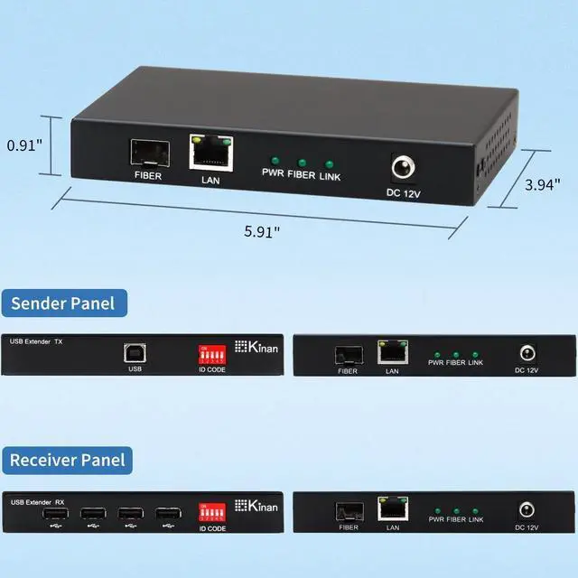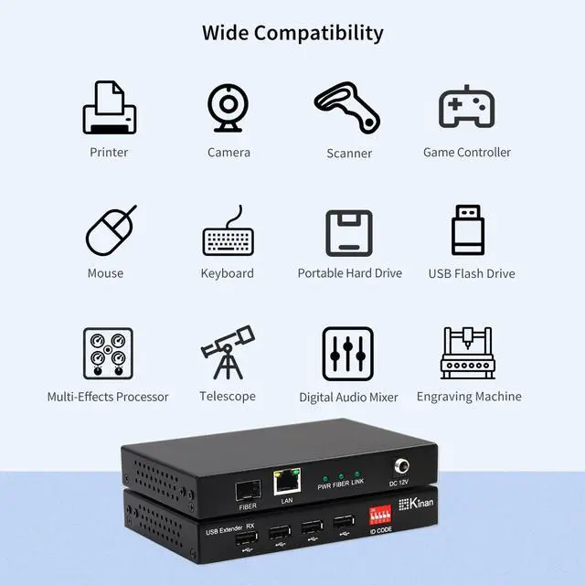 ^^ Designed for simplicity, this extender operates on a plug-and-play basis and requires no additional drivers for setup. It is compatible with most major operating systems, allowing for immediate integration into your existing setup. Just connect the power and cables to establish a stable, long-distance USB connection. ^^ The unit offers flexible connectivity through both SFP fiber modules and RJ45 Ethernet ports. A simple DIP switch on the transmitter and receiver allows for straightforward point-to-point pairing. Housed in a durable metal casing, the design supports effective heat dissipation and long-term reliability in diverse operating environments.
