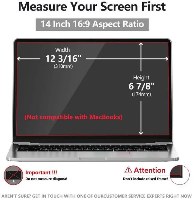 Inch Laptops Monitor- Width: 12 3/16" (310 mm), Height: 6 7/8" (174 mm), Diagonal: 14" ( 350.56 mm) Not for MacBook. Pozlle Blackout Privacy Filter is engineered to be compatible with Lenovo, HP, Dell, Acer, Asus, Samsung, and other laptop brands. Please verify your screen's width and height measurements before ordering. It's not recommended to make your selection based solely on your screen's diagonal size. [Not compatible with MacBooks] ^^ Easy to Install & Two Attachment Options- Simple installation, no bubbles, unlike traditional methods. Option Permanent installation method-double-sided tape sticking. uses clear adhesive strips that securely attach to any screen. Option uses slide mount tabs that easily stick to the display frame, allowing you to slide the filter on and off the screen as needed. ^^ Superior Privacy and Reduce Glare- Our advanced multi-layered film filter blacks out your screen when viewing from the side, while maintaining a crystal clear screen straight-on. This 13.3 inch privacy screen protector is reversible (matte/glossy): Gloss surface enhances privacy, matte surface reduces reflections. ^^ Eyes Protection & Anti GlareUpgraded High-quality filter layer that can reduce 95% of blue light and 92% of UV light. Matte surface, anti-glare, intercepts part of the reflected light. Anti-scratch layer to avoid scratches from daily use. Protect your screen while protecting your eyesight. ^^ Quality ServiceYou can use it in any place where you need to protect the privacy of your screen, including offices, coffee shops, airports, airplanes, trains... Available anytime, anywhere. Pozlle provide no-hassle refund for any reason, Replacement with free replacement if cracks, defects etc. If you have any questions, please feel free to contact us.