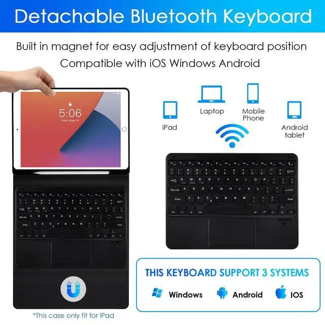 Detachable Bluetooth KeyboardMagnetically detachable keyboard is designed for smooth and fast writing, ergonomic keys layout with handy volume and brightness contro. Comfortable key buttons mute in typing, available for shortcuts setting, offers you quick operation with iPad for work and entertainment. ^^ The iPad keyboard case with Pencil HolderThe premium composition leather exterior and soft, non-slip interior protect your iPad from accidental drops and scratches. The built-in Pencil holder allows you to take your Pencil wherever you want.