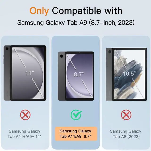 Perfectly Compatible: This case is only compatible with galaxy tab a11/a9 8.7" electronics tablets, not for other tablets. Please check your device and model number before purchase. Product Description. The samsung a11 tablet case features has 4 card slots for you to carry your ID, credit cards. 360-degree rotatable stand provides a more convenient viewing angle for reading, watching movies or typing while standing up. Bring more convenience to your daily lifePROTECTIVE: galaxy a9 8.7" tablet case premium PU leather and soft TPU case provides full body protection against scratchesshocks, drops and bumps. It features an elastic band closure that keeps the tablet secure when closed and protects the screen and built-in card from falling out. Classic, professional design.