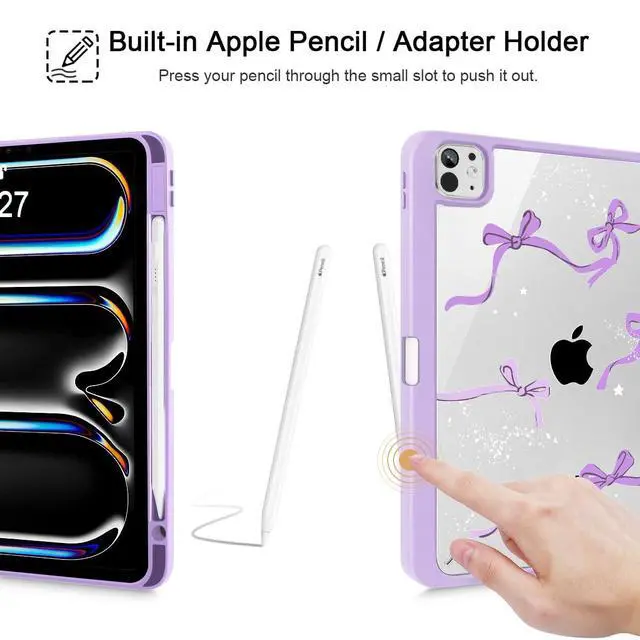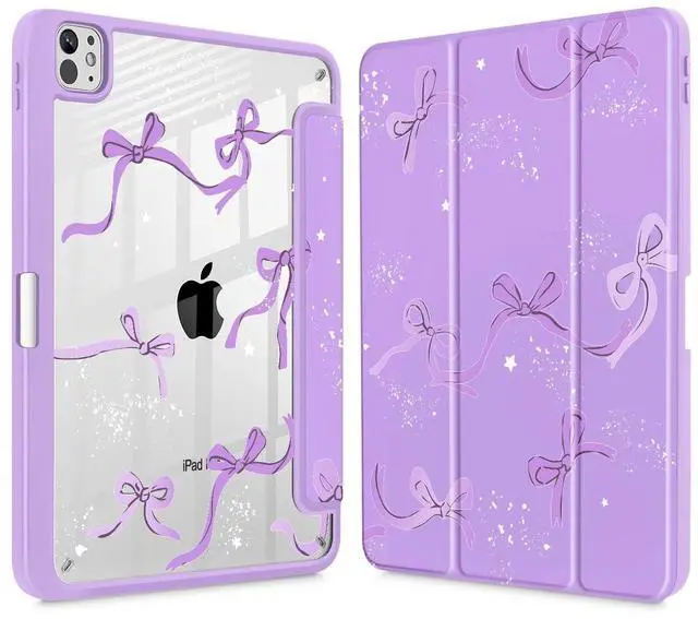 Tuiklol for iPad Pro 11 Inch (M5 2025 / M4 2024) Case, Buit-in Pencil Holder with Slim Clear Back Cover Protection Trifold Stand-Auto Wake/Sleep Tablet Case, Black Flower Bow-Purple