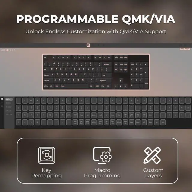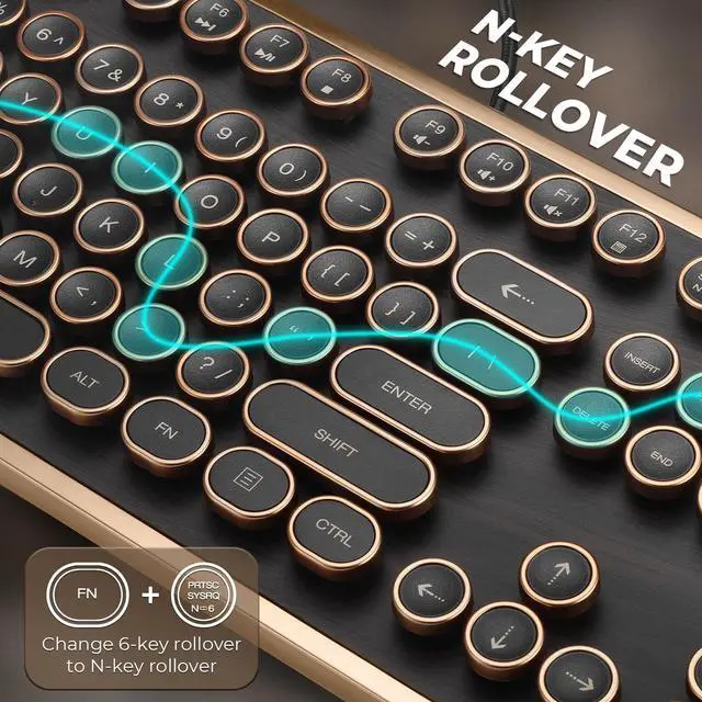 Vintage Charm, Modern PerformanceElevate your workspace with the RK104 Retro Mechanical Keyboard, featuring a stunning wood-grain finish and classic round typewriter keycaps. Underneath its nostalgic exterior lies advanced QMK/VIA programmability, allowing you to remap keys and create macros for a truly personalized typing experience.