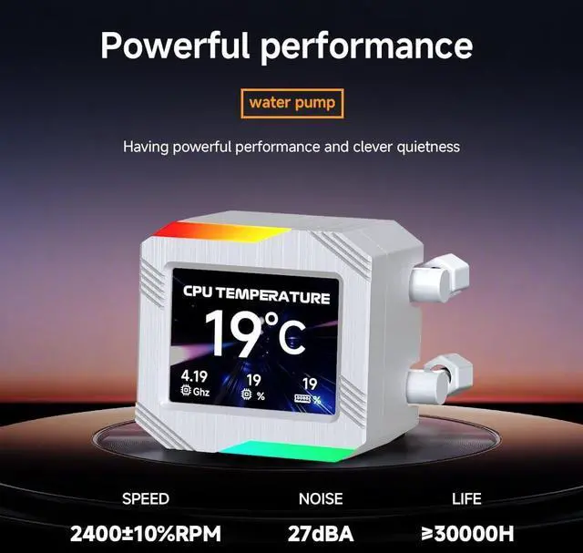 HIGH-PERFORMANCE PUMP: The pump operates at up to 2, 400 RPM to ensure efficient and quiet coolant circulation. the noise27dBAoperating life 30000H, efficient heat dissipation while remaining quiet ^^