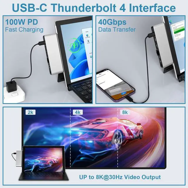 Fast Transmission: Type C Thunderbolt 4 supports 40Gbps data transmission, 2*USB 3.0 ports up to 5Gbps transfer. The built-in SD/TF (Micro SD) slot allows for easy access to files from SD/TF memory cards with a super speed of up to 480Mbps. Compatible with SDXC, SDHC, SD, MMC, RS-MMC, TF, Micro-SDXC, Micro-SD, Micro-SDHC, Mini-SD and UHS-I cards up to 2TB, allows you to transfer photos, videos, music and files quickly ^^ 100W USB-C Power Delivery & Perfect Combination: This docking station for surface pro 11 support USB C 100W pass-through power delivery. Special bevel-side and compact design of this docking station perfectly match your Surface Pro 9/Pro X. Ultra-small size makes it much easier to carry around for commuting and traveling