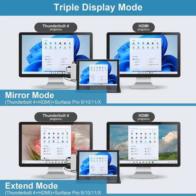(Note: Please confirm your tablet model before purchase, please remove your tablet case when using surface pro 9 hub docking station, so that the connection is not tight enough to affect the use of the effect). ^^ Triple Monitor Display Surface pro 11/10/9/X docking station: Triple monitor display ( 4K@60Hz HDMI + 8K@30Hz USB-C Thunderbolt 4 + Surface Pro 9) modes boost your efficiency 3 times. This Surface Pro 9 hub allows you to extend 2 monitors, so you dont have to go back and forth between programs or files. Surface Pro 9 docking support Extend Or Mirror Mode, HDMI Resolution up to 4K@30Hz, USB-C Thunderbolt 4 resolution up to 8K@30Hz ^^ Surface Pro 9 Adapter with RJ45 Ethernet & 3.5 mm