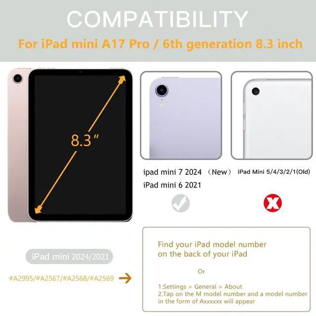 • Compatibility: Only designed for iPad Mini 7th/6th Generation Case 2024/2021 8.3 Inch.(Model:A2993/A2995/A2567/A2568/A2569) Before ordering, please check the model at the bottom of the tablet.